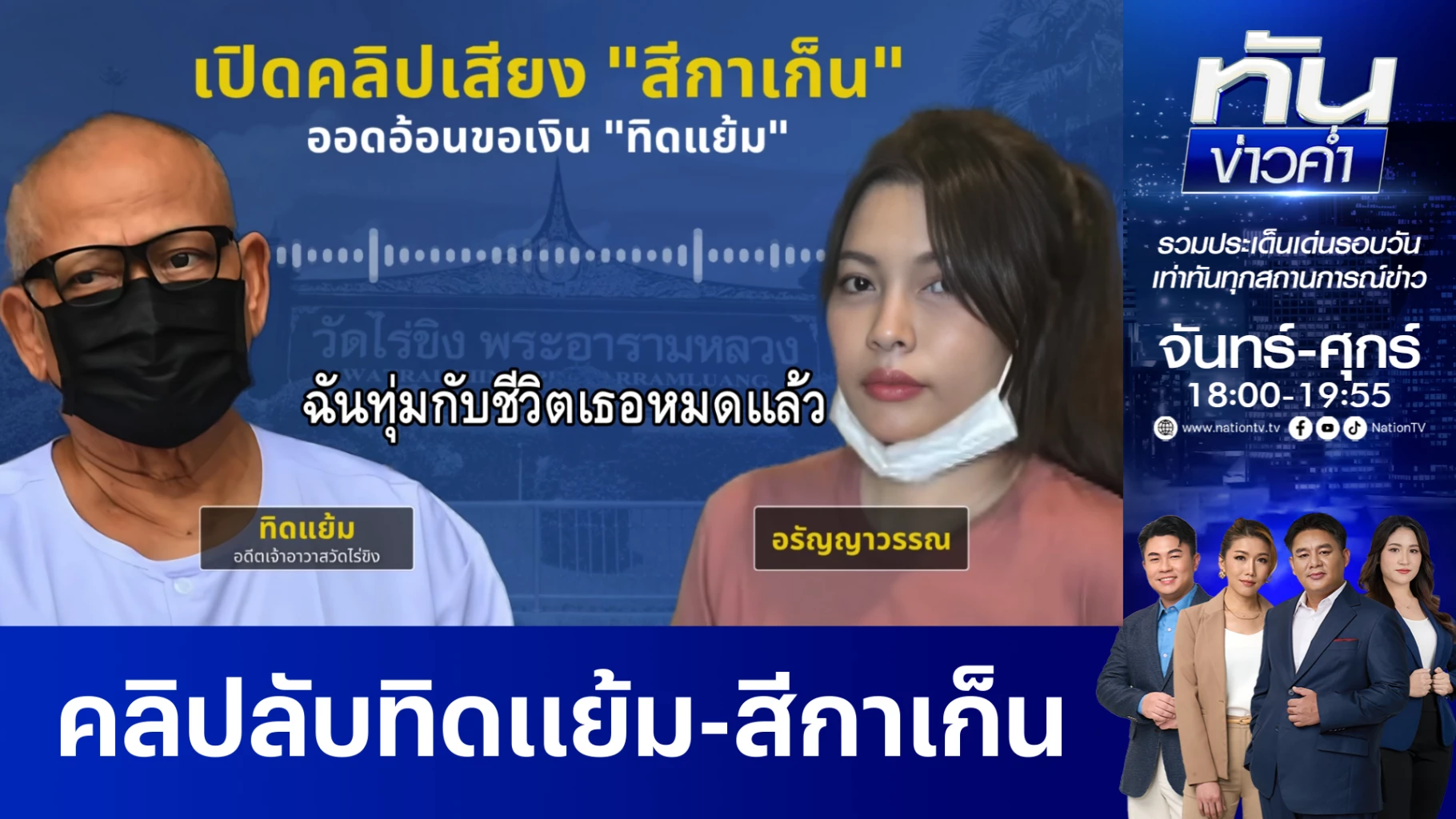 "บิ๊กเต่า" นำทีมแถลงความคืบหน้า คดียักยอกเงินวัดไร่ขิง ตะลึง พบยอดเงินหมุนเวียนในบัญชี "อรัญญาวรรณ"สาวคนสนิท กว่า 2,000 ล้านบาท / ช่วงหนึ่งของการแถลงข่าว ได้มีการเปิดหลักฐานคลิปเสียงการสนทนา ระหว่างทิดแย้ม อดีตเจ้าอาวาส วัดไร่ขิง กับ น.ส.อรัญญาวรรณ หรือ "สีกาเก็น" / จากข้อมูลโทรศัพท์ของทิดแย้ม ยังไม่พบความสัมพันธ์จากตัวทิดแย้มในการเล่นพนัน แต่ทิดแย้ม ทราบว่าสีกาเก็น เล่นการพนัน