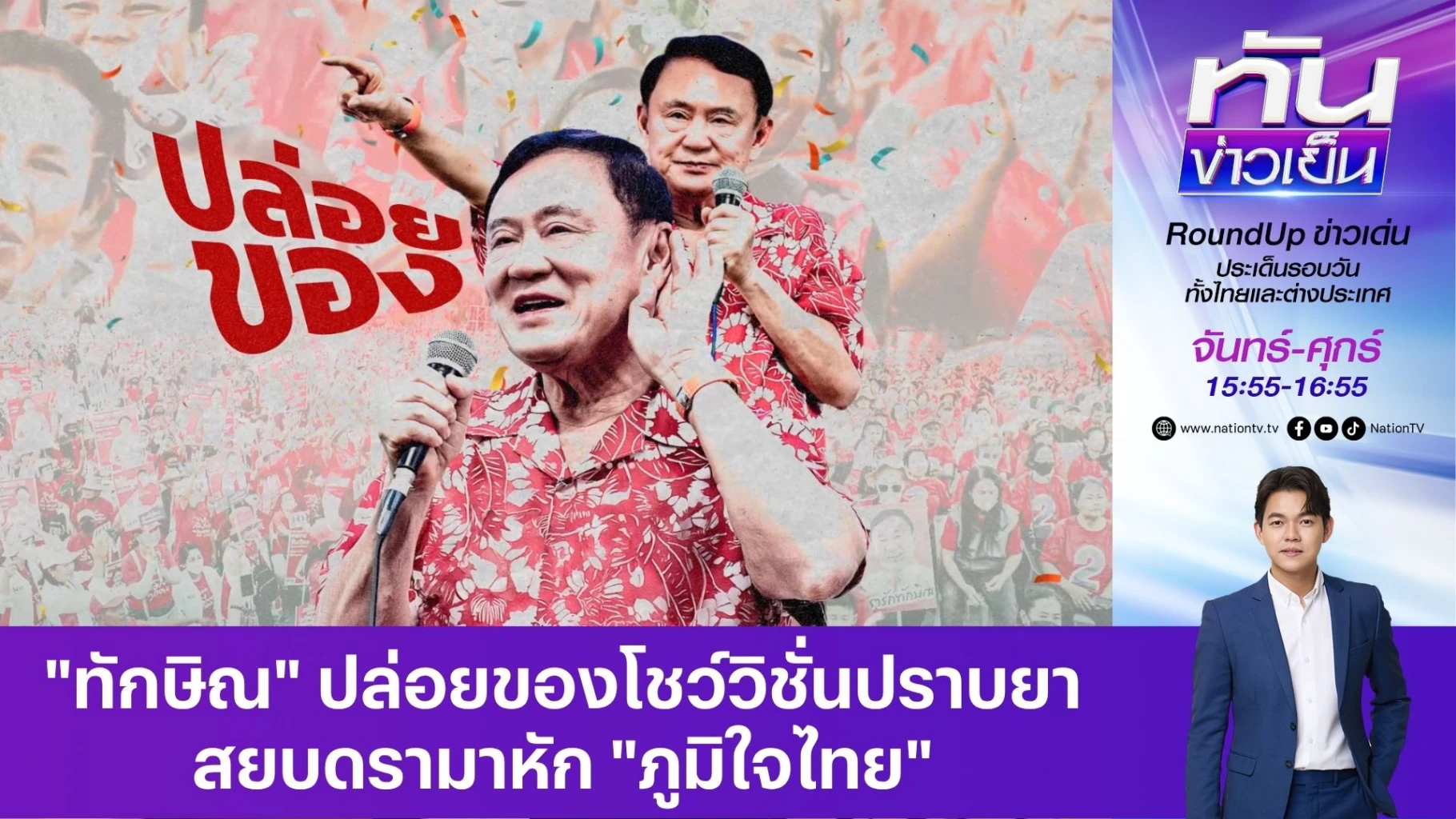 "ทักษิณ" มาตามนัด สยบข่าวหนี  ขึ้นเวทีโชววิชั่นแก้ยาเสพติด-อาชญากรรมข้ามชาติ เผย“ ยังอยู่ดี กินดี ไม่ได้หนีไปไหน” สบยดรามาหักภูมิใจไทย กอด อนุทิน โชว์สื่อ