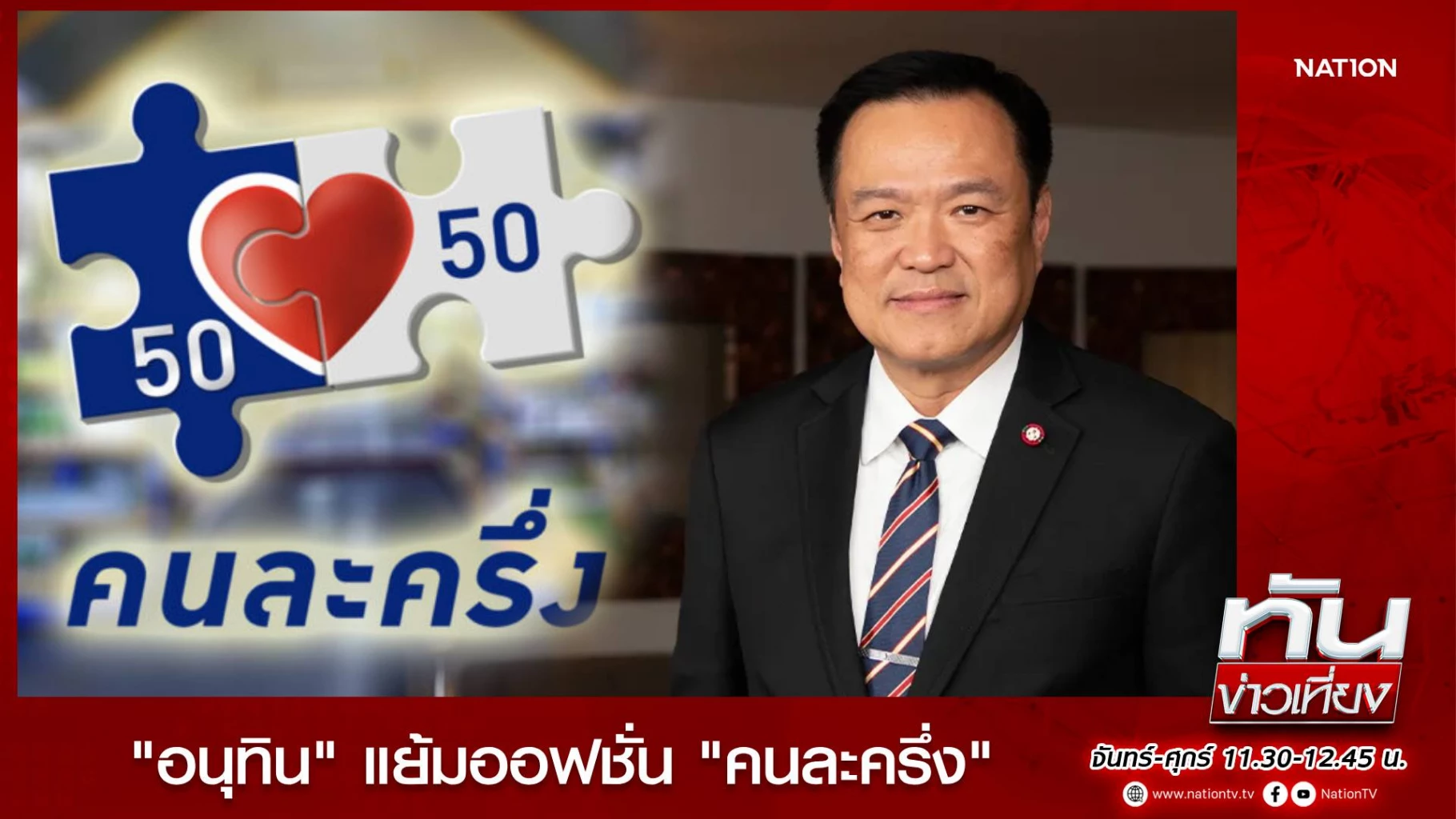 เปิดเงื่อนไขใหม่ โครงการ "คนละครึ่ง 2568" อนุทิน ชาญวีรกูล นายกรัฐมนตรี แย้มจะเป็นรูปแบบ "คนเสียภาษี" ได้สิทธิ 60:40 ส่วน "ประชาชนทั่วไป" ได้สิทธิ 50:50 พร้อมยืนยันโครงการคนละครึ่งจะทันในกรอบ 4 เดือน