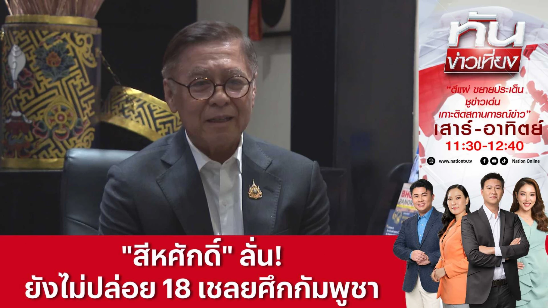 นายสีหศักดิ์ พวงเกตุแก้ว รัฐมนตรีว่าการกระทรวงการต่างประเทศ ซึ่งอยู่ระหว่างเดินทางเยือนประเทศภูฏาน ลั่น! ไม่เป็นความจริงหลัง “รมว.กต.กัมพูชา” อ้าง กัมพูชากำหนด 9 เงื่อนไขวงหารือ 4 ฝ่ายไทยต้องปฏิบัติตาม - ย้ำไทยจะปล่อย 18 เชลยศึกเมื่อเห็นผลดำเนินการ 4 ข้อบรรลุข้อตกลงเท่านั้น - ซัด! เขมรไม่ควรใหัสร้างความได้เปรียบฝ่ายเดียว ชี้สหรัฐฯ-มาเลเซียเห็นด้วยใช้เวทีทวิภาคีแก้ปัญหา