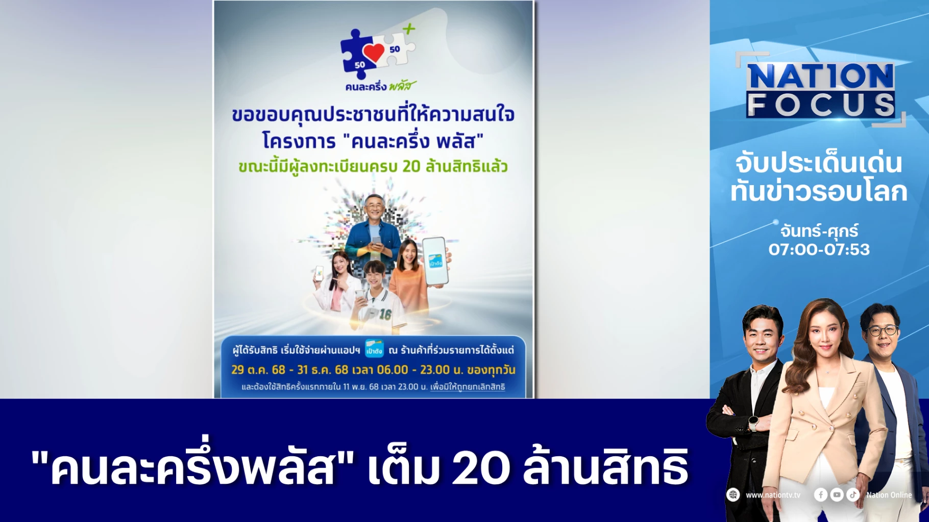 หลังจากเปิดให้ลงทะเบียนตั้งแต่เวลา 06.00 น. ของวันนี้ (20 ต.ค.68) โครงการ "คนละครึ่งพลัสเต็มแล้ว" จำนวน 20 ล้านสิทธิในที่สุดในเวลา 15.59 น. รวมเป็นระยะเวลาทั้งสิ้น 10 ชั่วโมง สะท้อนถึงความต้องการของประชาชนที่รอคอยมาตรการกระตุ้นเศรษฐกิจจากภาครัฐ