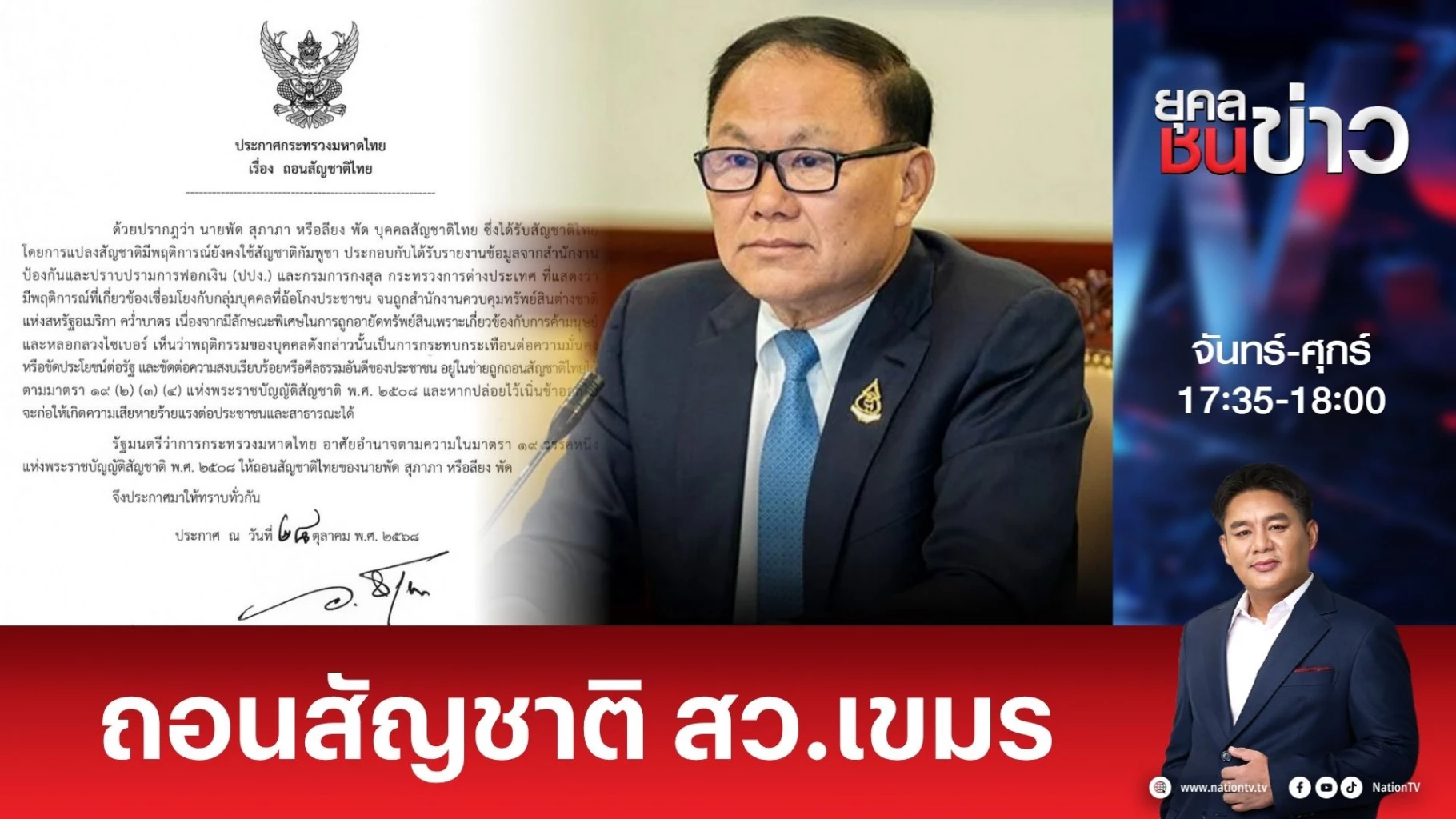 "อนุทิน" ลงนามประกาศถอนสัญชาติไทย "ลียง พัด" นักธุรกิจกัมพูชาที่ถือสองสัญชาติ หลังปรากฏชัดเดี่ยวข้องขวนการหลอกลวงทางไซเบอร์จนถูกหน่วยงานสหรัฐฯ คว่ำบาตร และ ปปง.สั่งอายัดทรัพย์สิน