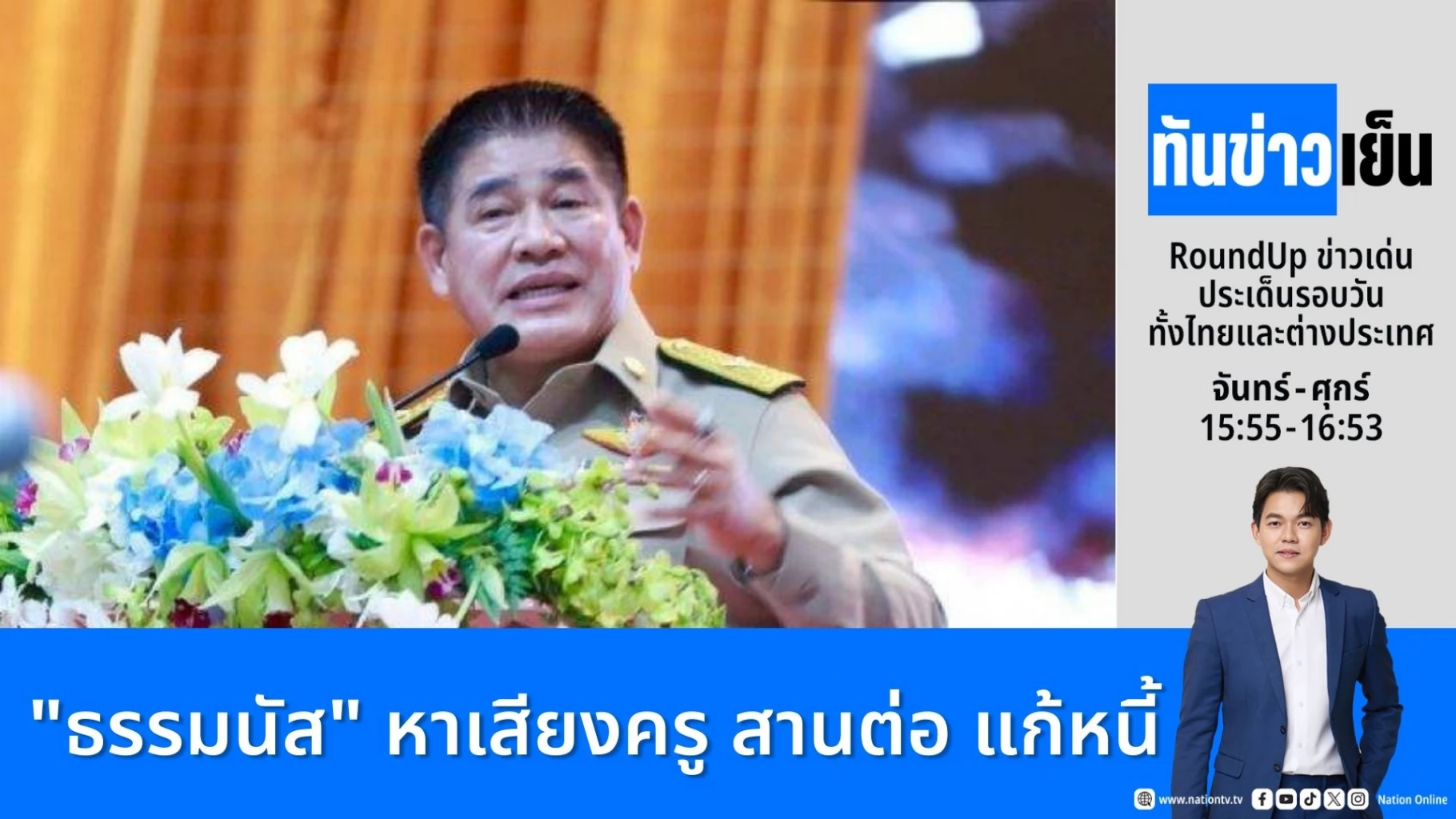 ร.อ.ธรรมนัส พรหมเผ่า เป็นประธานพิธีวันครูแห่งชาติ ครั้งที่ 70 ปี 2569 ย้ำเทิดพระเกียรติสมเด็จพระพันปีหลวง ผู้ทรงเป็นแม่และครูของแผ่นดิน ชี้รัฐบาลให้ความสำคัญคุณภาพชีวิตครู เดินหน้าแก้ปัญหาหนี้สิน สวัสดิการ ที่พัก และปรับเกณฑ์วิทยฐานะเพิ่มรายได้ยืนยันสานต่อนโยบายการศึกษา หากได้กลับมาดูแล ศธ. จะเร่งผลักดันกฎหมายและโครงสร้างเพื่อครูอยู่ดีมีศักดิ์ศรี