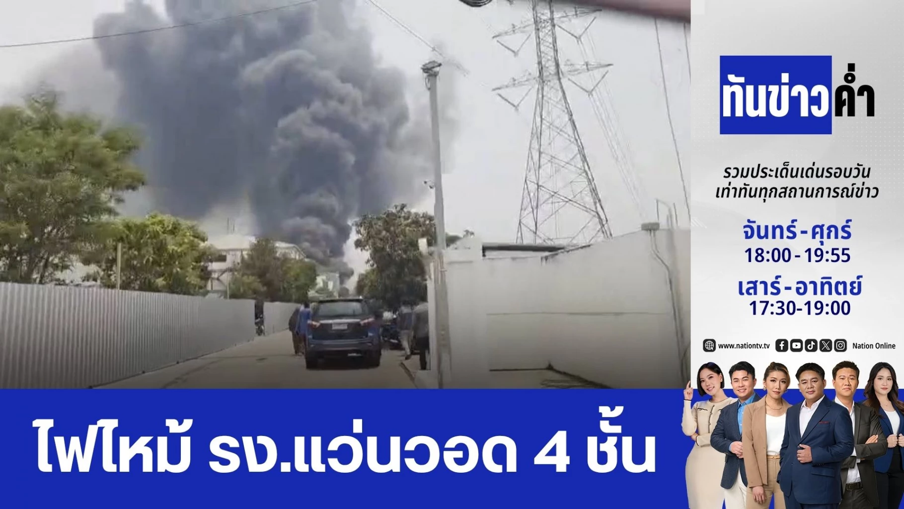ไฟไหม้โรงงานไทยออพติคอล กรุ๊ป ถนนบางบัวทอง-สุพรรณบุรี เจ้าหน้าที่เร่งระดมรถน้ำกว่า 20 คัน เข้าระงับเหตุเพลิงโหมลุกไหม้อาคาร 4 ชั้น นานกว่า 2 ชั่วโมง ล่าสุด (19 เม.ย.) เวลาประมาณ 14.30 น. สถานการณ์เริ่มคลี่คลายหลังเจ้าหน้าที่ควบคุมเพลิงไว้ได้ในวงจำกัด ยังไม่มีรายงานผู้ได้รับบาดเจ็บหรือเสียชีวิต