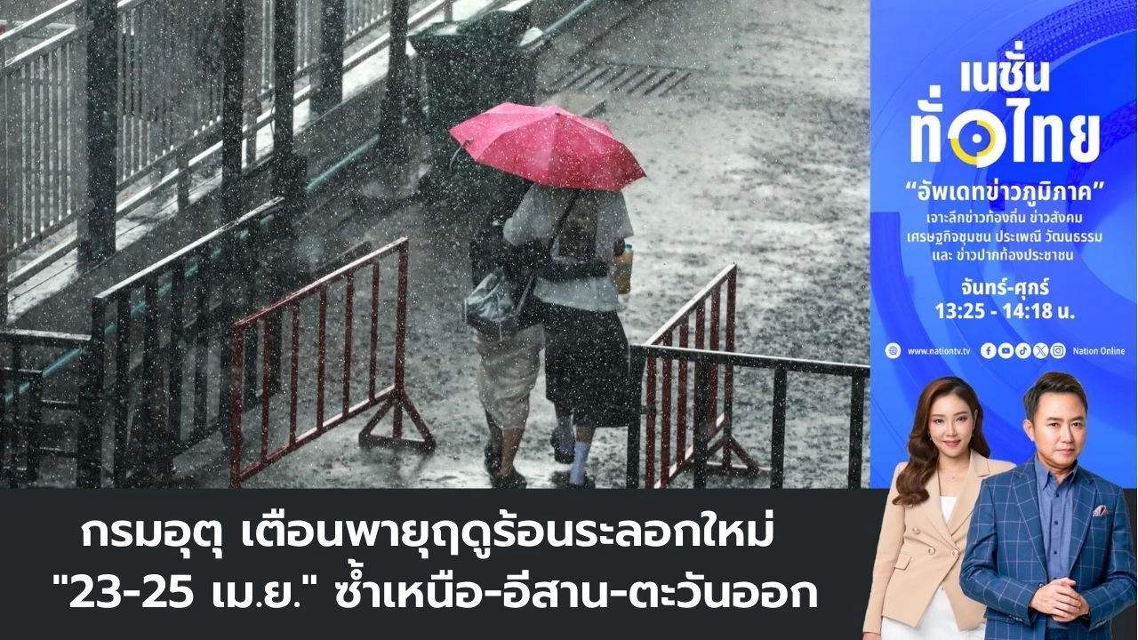 - กรมอุตุนิยมวิทยาประกาศเตือนประชาชนพื้นที่ภาคเหนือ อีสาน และตะวันออก เตรียมรับมือพายุฝนฟ้าคะนอง ลมกระโชกแรง และลูกเห็บตกในช่วงวันที่ 23–25 เมษายน 2569 ก่อนจะกระทบภาคกลางและกรุงเทพฯ ในระยะถัดไป หลังมวลอากาศเย็นจากจีนแผ่ลงมาปะทะอากาศร้อนจัด ล่าสุดที่ อ.ครบุรี จ.นครราชสีมา เกิดพายุพัดถล่มรุนแรงทำร้านอาหารตามสั่งและคอกวัวพังราบ เจ้าของร้านวัย 74 ปี เผยนาทีระทึกต้องใช้ตู้เสื้อผ้าบังลมพายุที่ซัดหลังคาปลิวหายทั้งแถบ ยอมรับรุนแรงที่สุดในรอบหลายปี เตือนเกษตรกรและประชาชนเฝ้าระวังสิ่งปลูกสร้างไม่แข็งแรงและดูแลสุขภาพในช่วงอากาศแปรปรวน