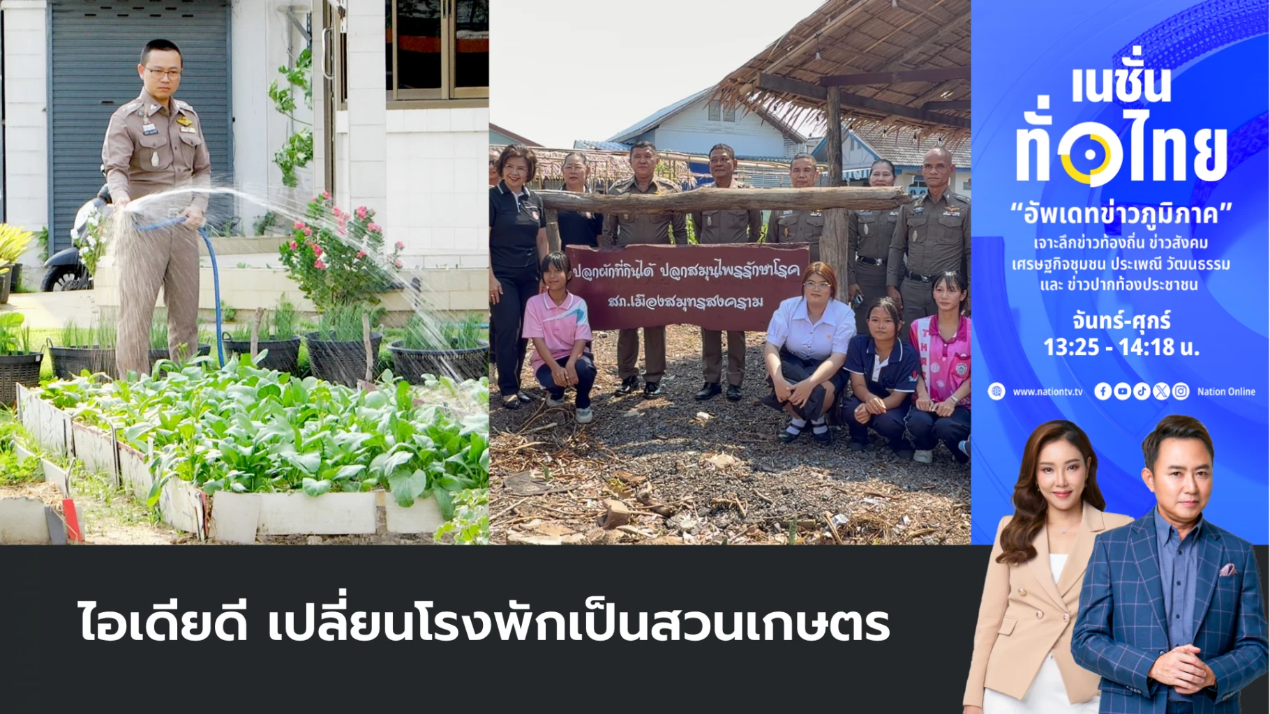- เจ้าหน้าที่ตำรวจจราจร สภ.เมืองสุพรรณบุรี นำโดย พ.ต.ท.กวินท์ อดุลยาศักดิ์ รอง ผกก.จร. ร่วมแรงร่วมใจเปลี่ยนพื้นที่รกร้างข้างป้อมจราจรแยกหอนาฬิกา ให้กลายเป็น "สวนผักรั้วกินได้" ปลูกพืชผักหลากหลายชนิด ทั้งคะน้า ผักสลัดออร์แกนิก และพืชสวนครัวนานาพันธุ์ เพื่อนำมาเป็นวัตถุดิบทำอาหารกลางวันเลี้ยงกำลังพล ช่วยลดภาระค่าใช้จ่ายและเสริมสร้างความสามัคคีในหน่วยงาน โดยผลผลิตที่เหลือจากการบริโภคยังนำไปแจกจ่ายให้ครอบครัวตำรวจและประชาชนในพื้นที่ สร้างรอยยิ้มและความประทับใจให้กับผู้ที่สัญจรผ่านไปมา จนกลายเป็นต้นแบบการใช้พื้นที่ว่างให้เกิดประโยชน์สูงสุดตามหลักเศรษฐกิจพอเพียง