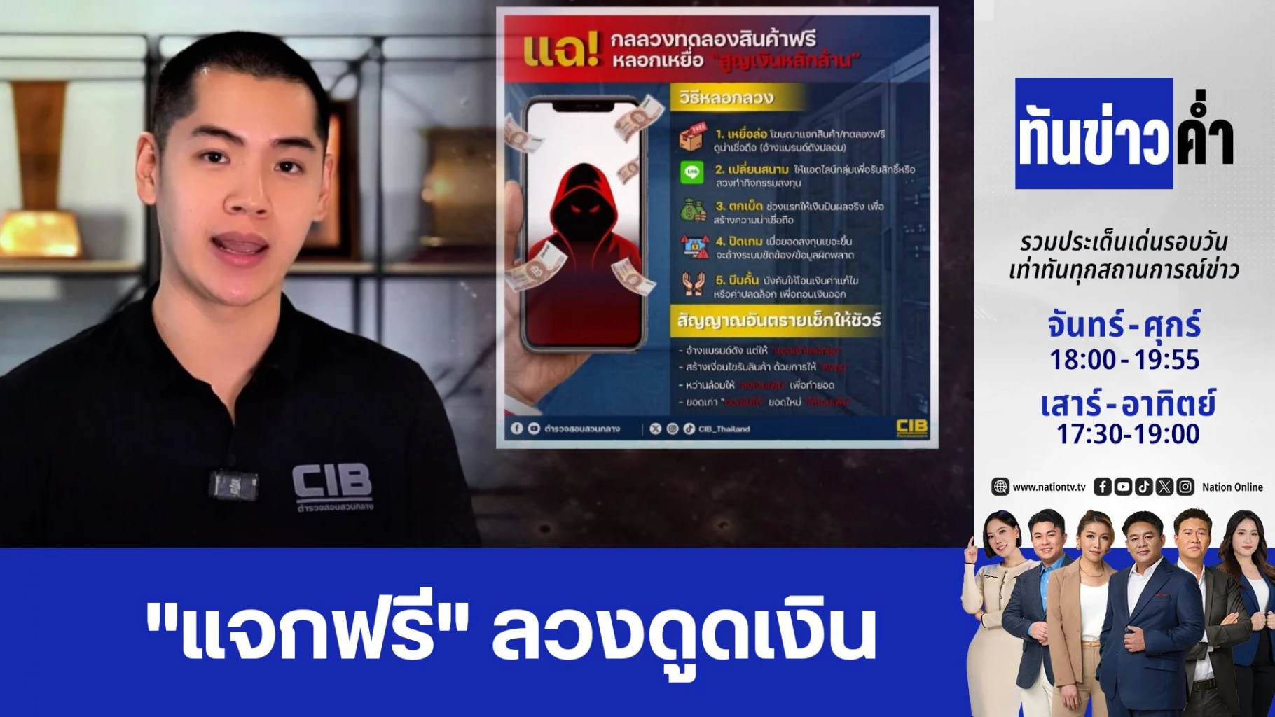 สกู๊ปพิเศษ "CIB เตือนภัย" วันนี้ (27 เม.ย.) ตำรวจสอบสวนกลาง นำข้อมูลมาเปิดพฤติการณ์มิจฉาชีพสร้างกลลวงแจกของฟรี โดยโพสต์ผ่านสื่อโซเชียลฯ อ้างสินค้าแบรนด์ดัง หลอกให้กดรับสินค้า ทดลองใช้ ฟรี ไม่มีค่าใช้จ่าย สุดท้ายอาจทำให้ผู้หลงเชื่อสูญเงินหลักล้าน ติดตามรายละเอียดได้จาก "ผู้กองวิน"