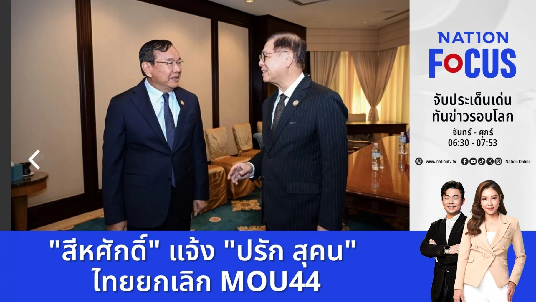 นายสีหศักดิ์ พวงเกตุแก้ว รองนายกรัฐมนตรีและรัฐมนตรีว่าการกระทรวงการต่างประเทศ ได้มีการหารือทวิภาคีกับ นายปรัก สุคน รัฐมนตรีกระทรวงต่างประเทศของกัมพูชา โดยประเด็นสำคัญระหว่างการหารือ คือฝ่ายไทยได้แจ้งต่อกัมพูชาถึงการดำเนินการที่จะ “ยกเลิก” MOU44 โดยฝ่ายไทยจะมีการส่งหนังสือยืนยันอย่างเป็นทางการให้กับฝ่ายกัมพูชา หลังจากคาดว่ามติการประชุมคณะรัฐมนตรีอาจยกเลิก MOU ดังกล่าว